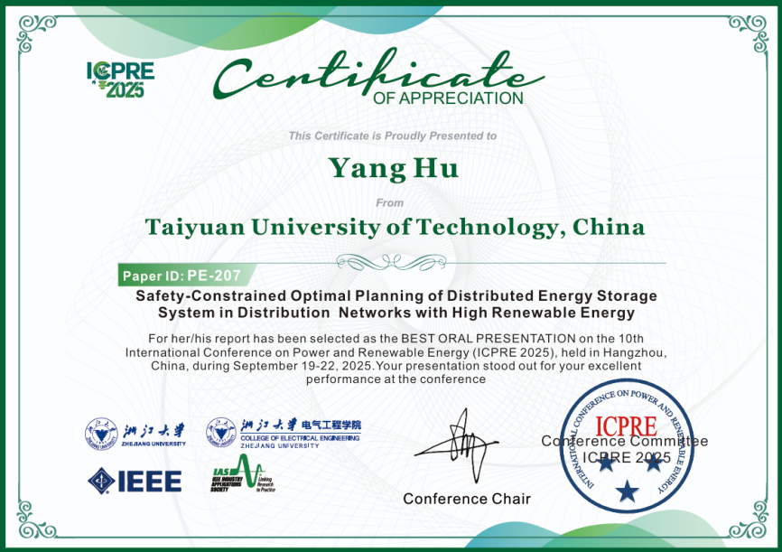 硕士研究生胡杨在“Energy Internet and Integrated Energy Systems for Urban Infrastructure”(城市基础设施中的能源互联网与综合能源系统)专题分会上作了题为《Safety-Constrained Optimal Planning of Distributed Energy Storage System in Distribution Networks with High Renewable Energy》的口头报告。研究提出了融合场景生成、安全约束与智能优化的分布式储能系统规划方法,在经济性、低碳性与系统安全性方面取得突出成果。凭借研究的创新性和工程价值,胡杨同学的报告荣获该分会“最佳报告奖(Best Presentation Award)”。