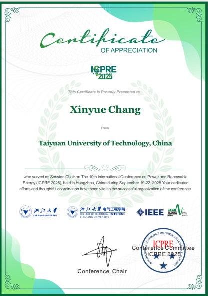 太原理工大学电气与动力工程学院常馨月副教授受邀担任分会主席,主持了题为“Modeling, Control, and Market Trading Mechanisms for Virtual Power Plants with Heterogeneous Resource Aggregation”(异质资源聚合虚拟电厂的建模、控制与市场交易机制)的专题分会。该分会共有7场口头报告,来自多家高校与科研机构的专家围绕虚拟电厂的调度控制、市场交易机制与多源聚合策略展开深入探讨,并就价格信号设计、市场激励机制与系统安全保障等问题进行了热烈交流,为虚拟电厂未来发展方向提供了新思路。